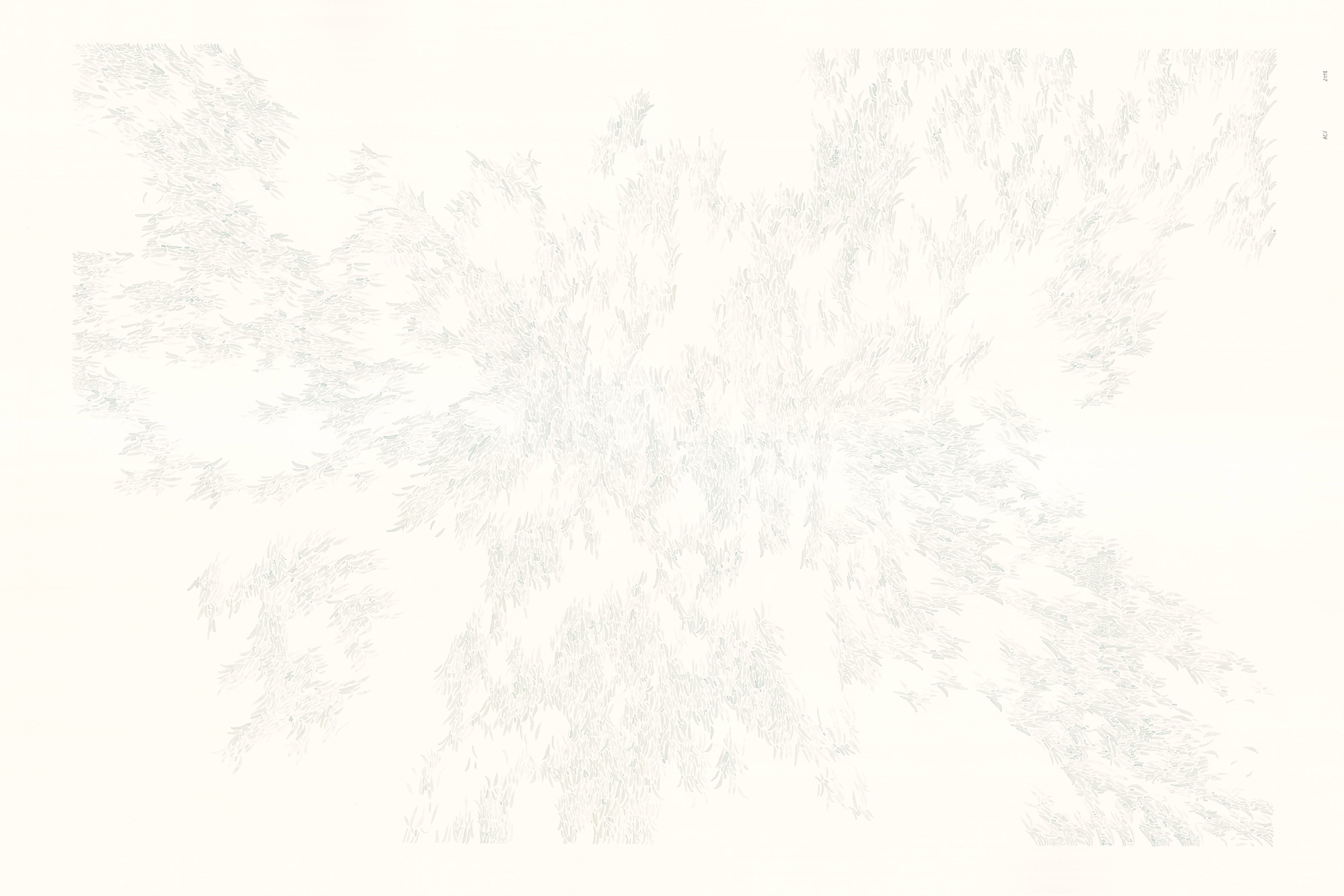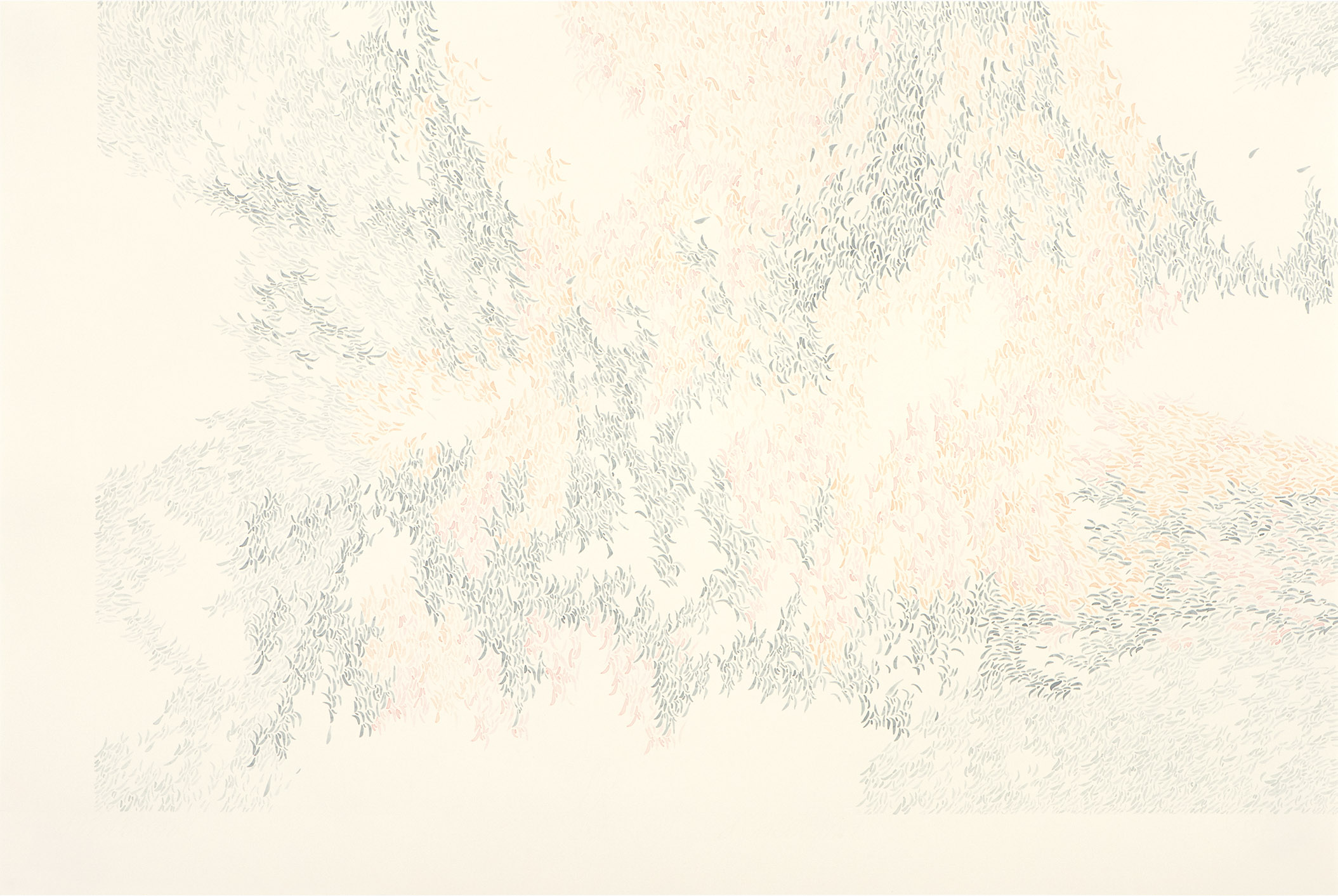 El traslado a Christchurch, Nueva Zelanda, a comienzos del año 2018 generó un movimiento en mi práctica, una vuelta al agua y la fragilidad de la acuarela. Empecé trabajando en formato pequeño, cada obra en un pliego de papel. Sin embargo, al desplegar todas las obras juntas, sentí la necesidad de explorar qué pasaría si traspasaba los límites del pliego. Este experimento lo llamé “Mareas”, una obra compuesta de nueve pliegos, que me permitió derribar mitos en torno a la acuarela y sus múltiples posibilidades.